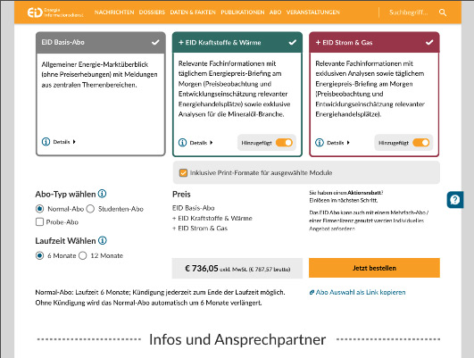 Je nach Auswahl von Modulen und Abo-Typ wird automatisch der Preis berechnet und angezeigt.